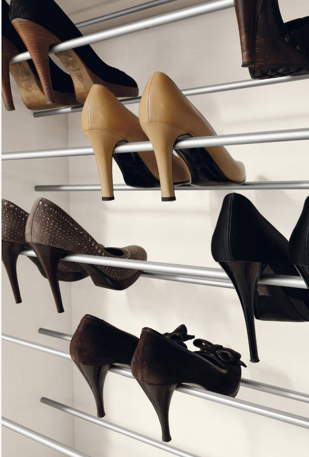 Для того чтобы все пары обуви, и даже те, что находятся на верхних полках, были отлично видны, целесообразно монтировать поверхности для хранения. Но при этом возникает другая проблема – необходимо, чтобы ваши босоножки и сапоги не съезжали с полок – невысокие бортики или металлические струны помогут решить этот вопрос.