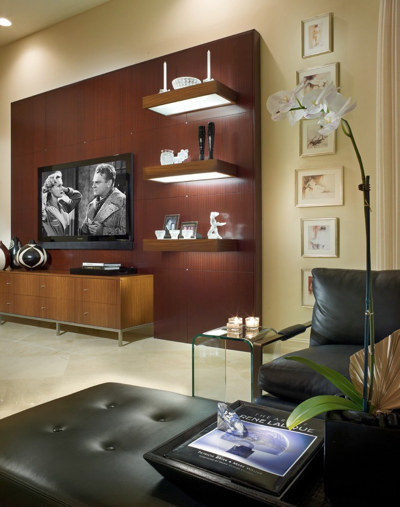 Выбирайте полки из различного сырья, в основном из дерева, мебельных щитов и металла. Рассмотрите также стеклянные конструкции, и даже те, которые имеют кожаные элементы. Какой материал выберете для полки, во многом зависит от дизайна интерьера, стиля гостиной и желаемого эффекта.