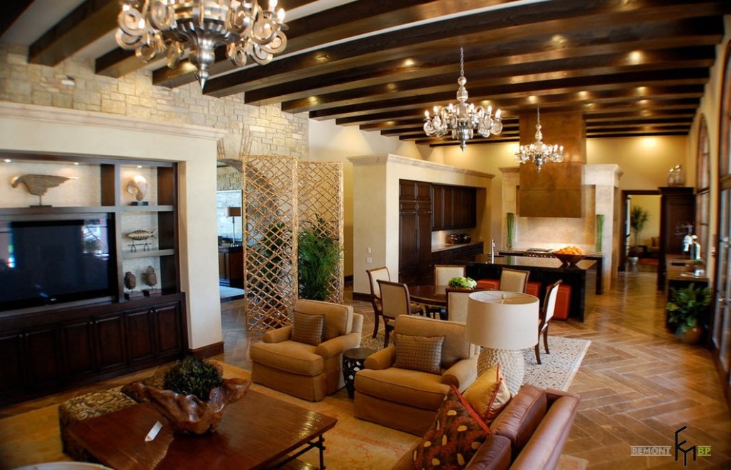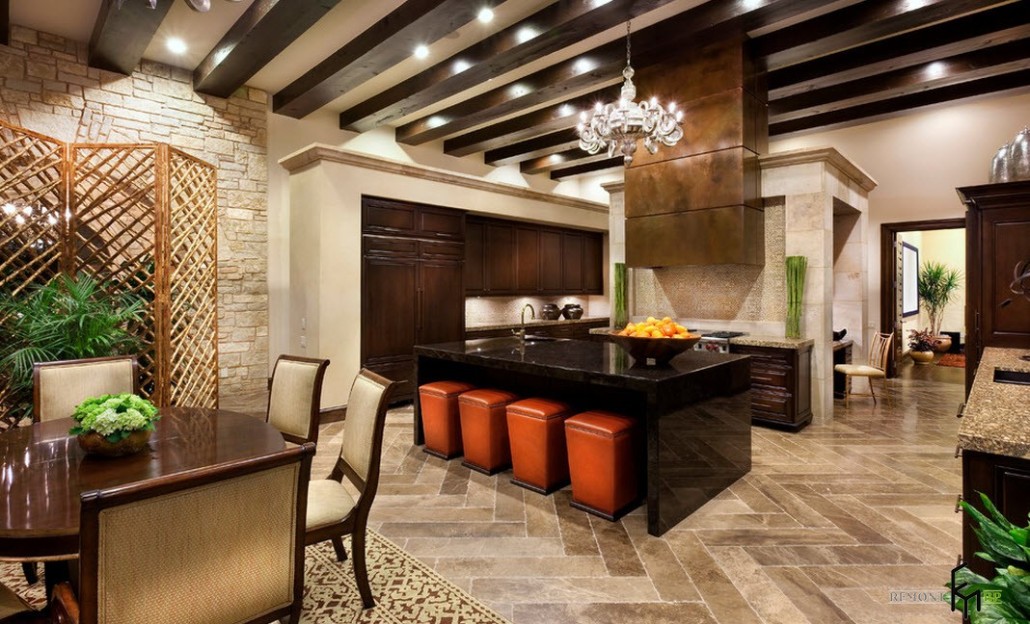 Прихожая такого великолепного дома украшена необычной люстрой в форме плоского металлического диска. Она прекрасно сочетается с выложенным камнем полом. Мозаика на потолке гармонирует с остальными элементами декора по цвету и форме мелких деталей. Грубая массивная дверь из дерева дарит ощущение надежности и защищенности от проникновения незваных гостей.