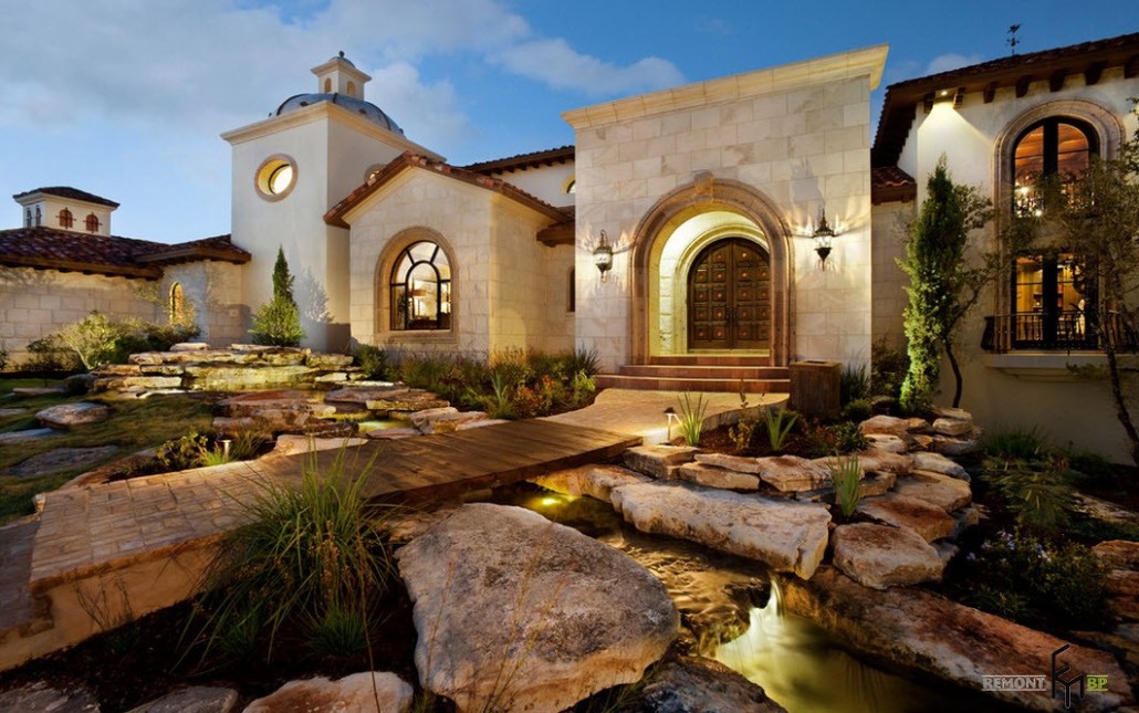 Огромный особняк, содержащий в своем оформлении элементы различны стилей, стал ярким примером такой дизайнерской работы. Для украшения фасада здания используются разные техники от применения натурального камня до штукатурки. Объединены они все одним светлым тоном. Для гармоничного сочетания с ландшафтным дизайном используются несколько видов облицовки дорожек.