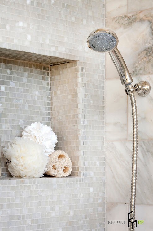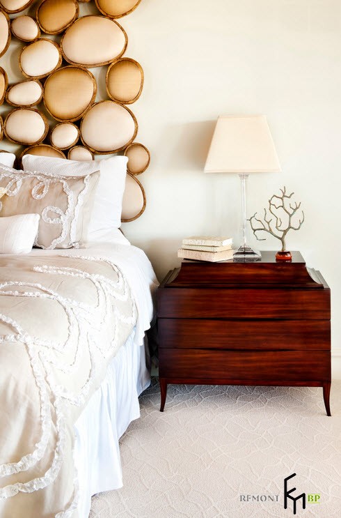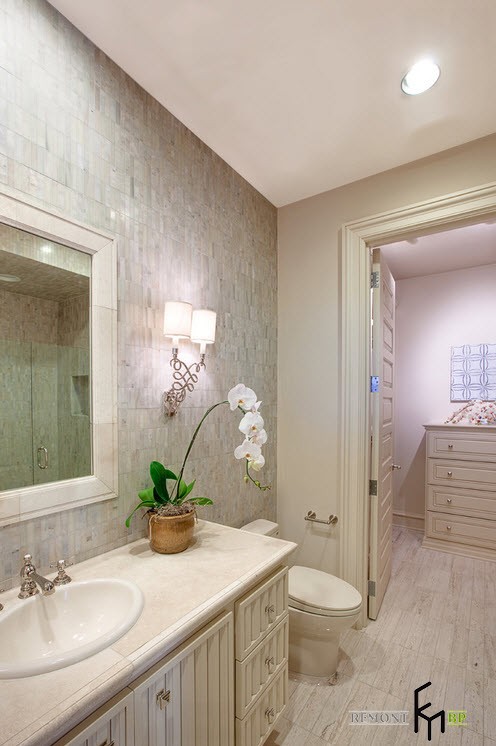В отличие от кабинета, спальня и ванная выдержаны в нежных оттенках и плавных линиях. Цветы на столе, изысканные украшения и узоры на аксессуарах выдают присутствие женщины. Обе комнаты наполнены светом.