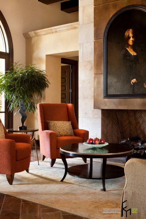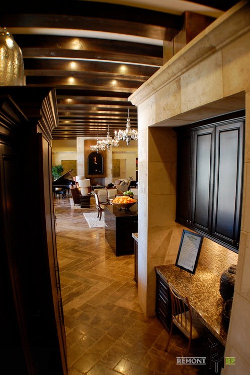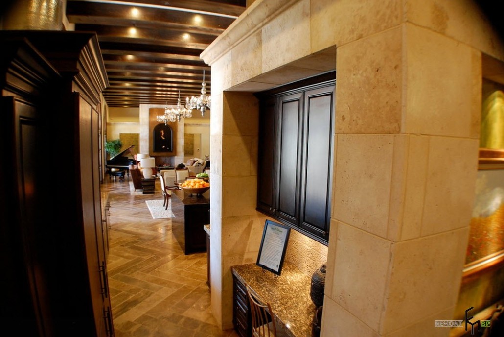Внутреннее убранство дома поддерживает иллюзию пребывания в сказочном замке. Дальнейшее перемещение по коридорам под каменными арками заставляет восхищаться идеальным сочетанием мелких деталей. Старинные картины на стенах будто изображают благородных предков хозяев дома. Мебель, обтянутая светлой кожей, отлично гармонирует с облицовкой полов.