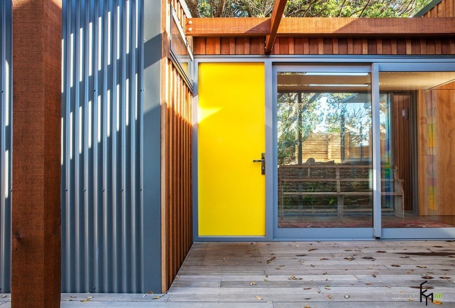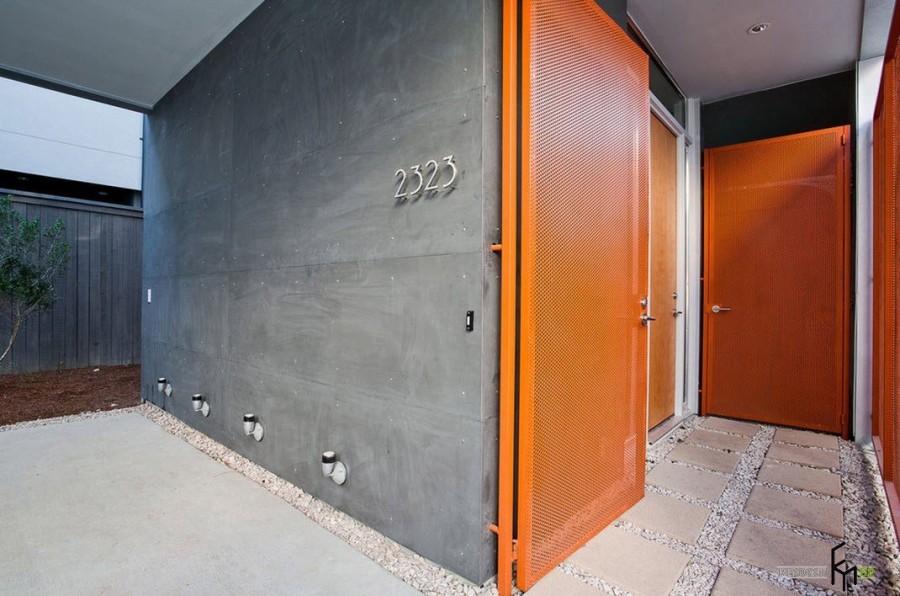 Апельсиновый оттенок каркаса двери был повторен в конструкциях оконных рам, создавая весьма колоритный ансамбль на фоне ничем не примечательного темно-серого фасада.