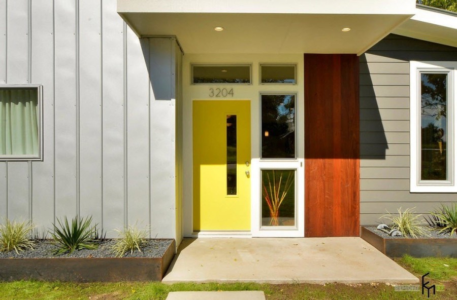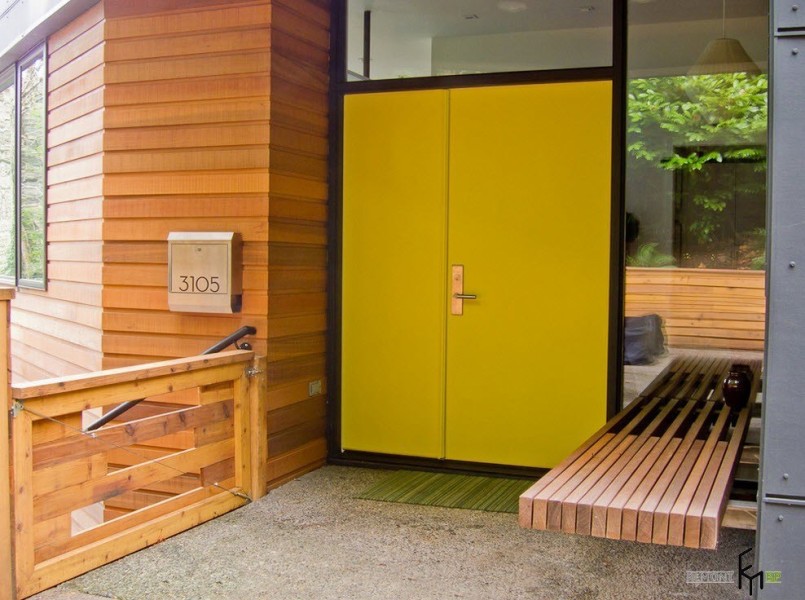 Насыщенный яркий цвет входной двери преображает спокойную отделку фасада здания. Небольшая стеклянная вставка возле двери позволит жильцам видеть посетителя изнутри помещения.