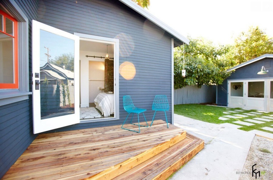 При оформлении подхода к главной двери дома, в случае если он имеет невысокий фундамент, часто достаточно сооружения деревянного помоста или палубы, которая может послужить помимо прочего и зоной для организации места отдыха для взрослых и игр для детей.