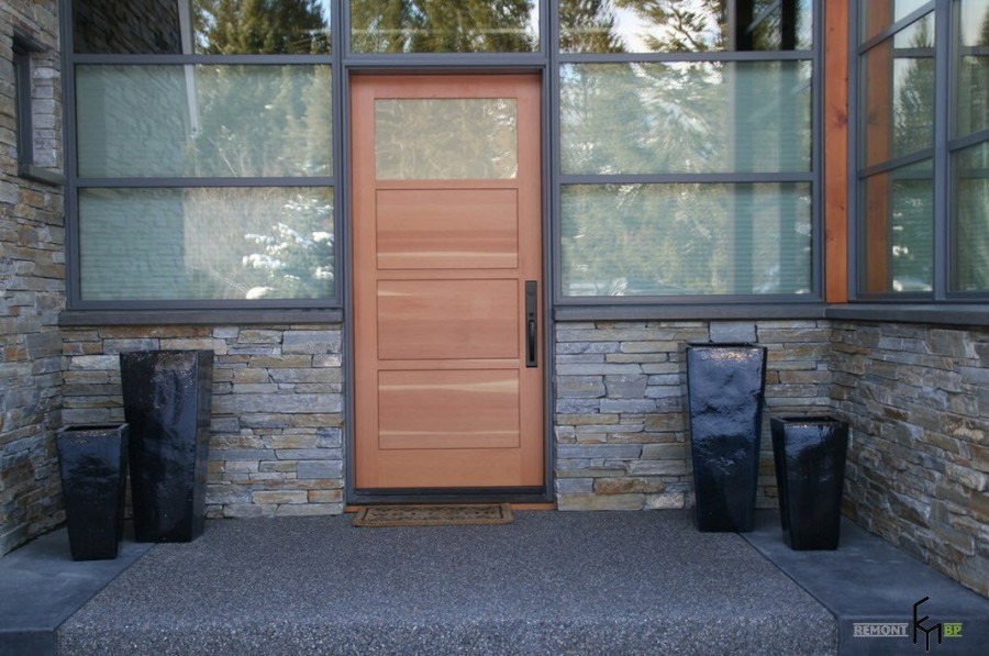 Двери необычного дизайна со стеклянными вставками и медными элементами способны стать визитной карточкой современного здания. На фоне каменной облицовки выигрышно смотрятся оригинальные настенные фонари для улицы в форме пирамид.