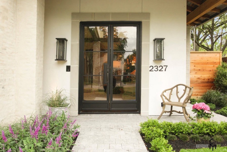 Большие двустворчатые двери с черным каркасом, стеклянными и зеркальными вставками, симметричное расположение настенных фонарей и кадок с растениями создали сбалансированный и гармоничный образ главного входа частного домовладения.