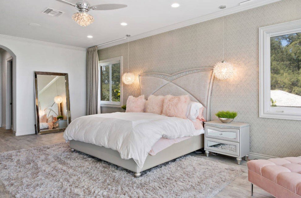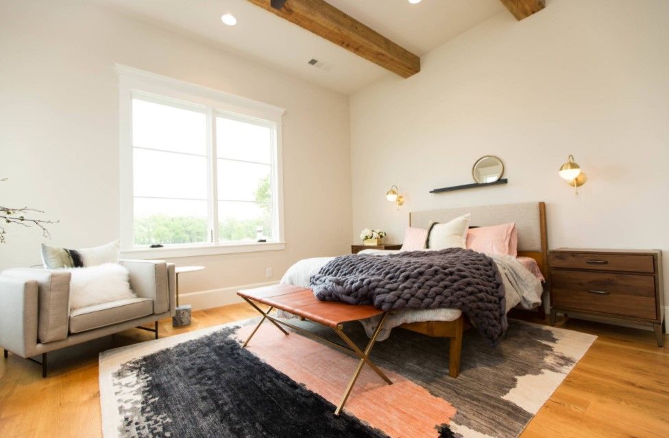 Для того, чтобы обитателям комнаты было не только уютно, но и удобно, спальню необходимо зонировать. Функциональность в данном случае подчеркивается только визуально, но такие образом все равно получается упорядочить пространство.
