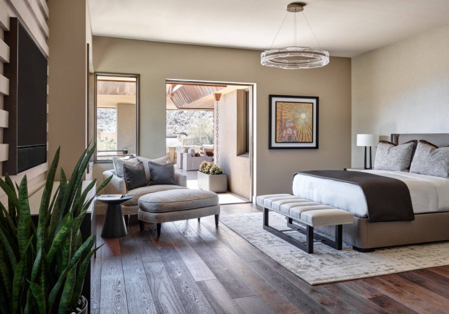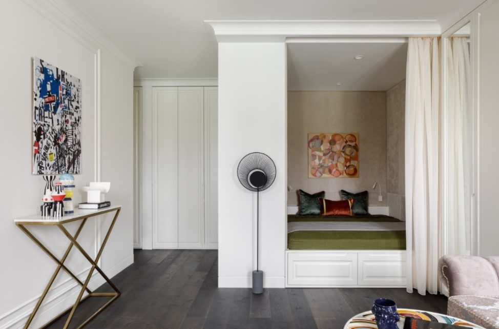Его от минимализма отличают такие личные акценты, как семейные фото и портреты, статуэтки и другие памятные украшения. Во всем остальном соблюдается нейтральность: спокойный цвет отделки, выразительность при помощи настенных фактур, натуральные материалы, четкие линии в обстановке. Мебель используется по минимуму, поэтому допустимо выбирать многофункциональные модели.