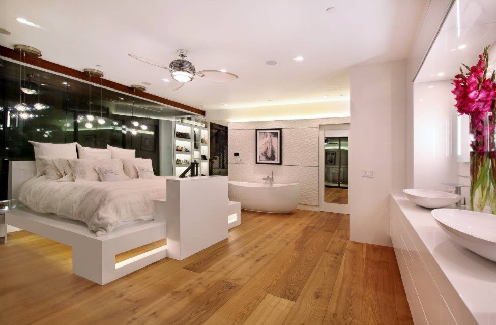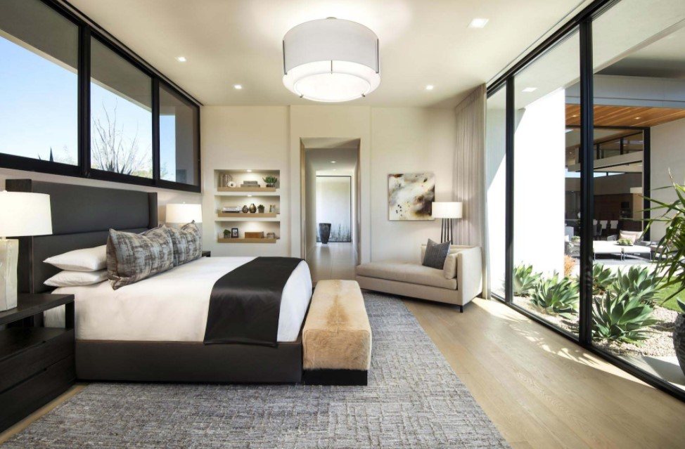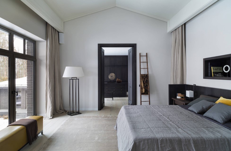 Наконец, в минималистическом стиле область хранения выносится за пределы спальни или отделяется перегородками и шторами, чтобы визуально была видно только кровать и тумбочки.