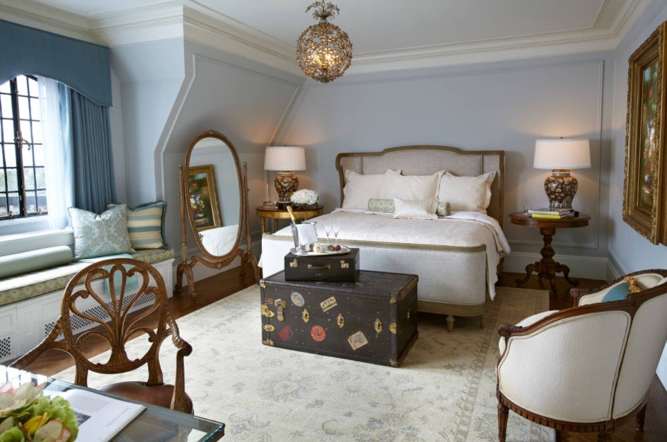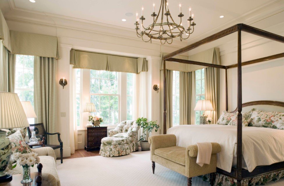 В данном интерьере предстоит использовать акцентные детали из бордового, изумрудного, коричневого цвета. Это может быть обивка, шторы или пастельный текстиль. Расстановка в комнате выполняется симметричным образом. В интерьер могут использоваться обои с растительным принтом. Шкаф подразумевает двух- или трехстворчатую конструкцию.