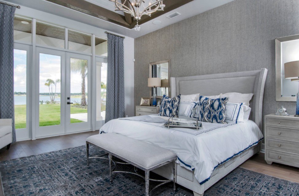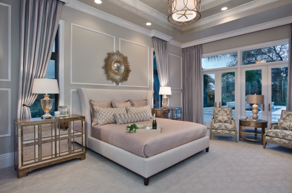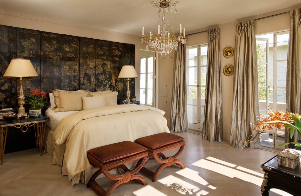 Кроме того, зонирование должно выполняться в зависимости от стиля интерьера. В классическом дизайне, например, кровать располагается по центру комнаты. Значит шкаф стоит вдоль стены и напротив окон, образуя ассиметричную планировку. При симметричном расположении кровать оснащены прикроватными тумбочками с каждой стороны, а на противоположной стене крепится телевизор. Шкафы в данном случае используются парные по обе стены друг напротив друга.