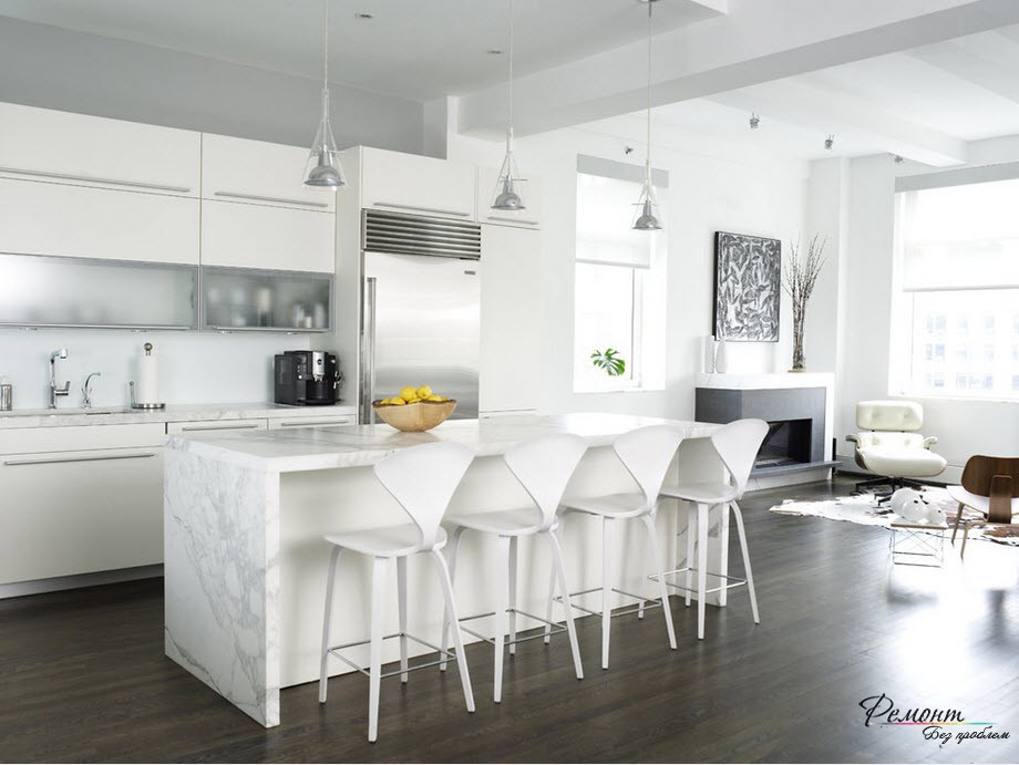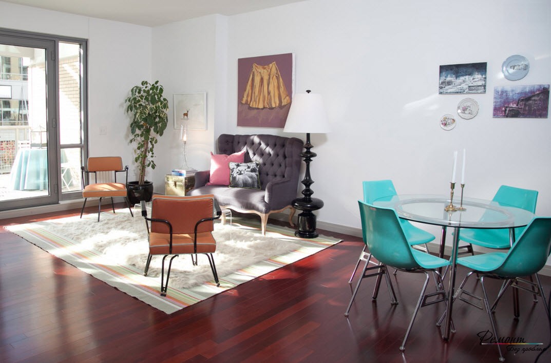 В белой гостиной бирюзовые стулья вокруг прозрачного столика создадут небольшой оазис. О чем это говорит? О том, что при помощи цветовых вариаций и правильного использования контраста, можно сделать зонирование, но, не просто поделив комнату на части, а создав в ней совершенно другую атмосферу.