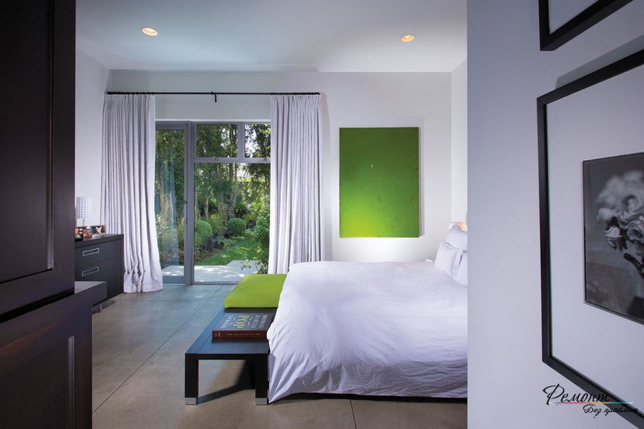 Добавив в белый интерьер зеленый цвет, мы получаем более расслабляющую обстановку. Ведь белый цвет немного строговат, а если речь идет о спальной комнате, то здесь просто необходимо внести нечто располагающее к отдыху. Но не очень удачным выбором будут яркие оттенки зеленого, такие как, салатовый и лайм. Их кислотность не даст спокойно уснуть. Поэтому лучше взять основной зеленый цвет или на тон ниже, то есть более темный оттенок.