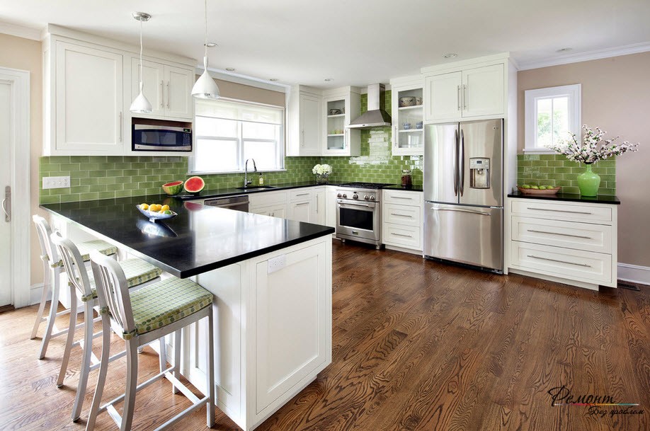 В отношении кухни поступают также то есть выбирают более спокойные тона зеленого, так как вообще любые сочные цвет в кухне не слишком хорошо сказываются на аппетите.