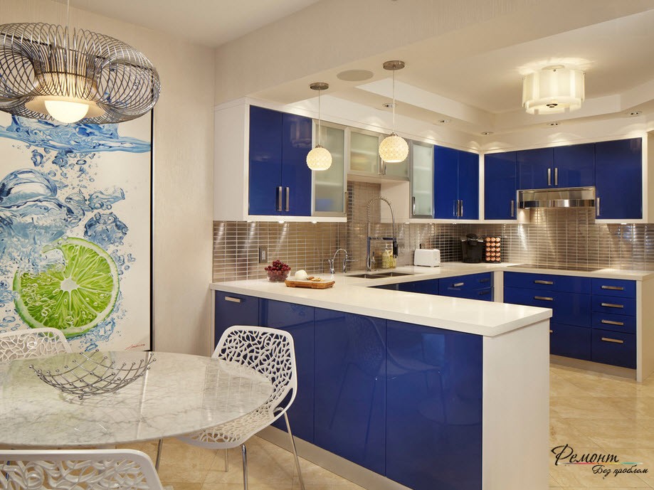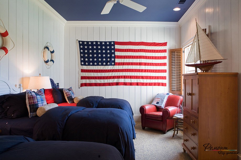 К бело-синему интерьеру можно добавить теплоту красного цвета, это позволит немного расслабиться и почувствовать себя более раскованно.
