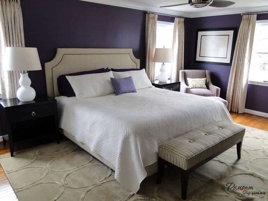 Насыщенный фиолетовый цвет, добавленный в белую спальню, будет благоприятно сказываться на сне, засыпать будет приятно и спокойно.