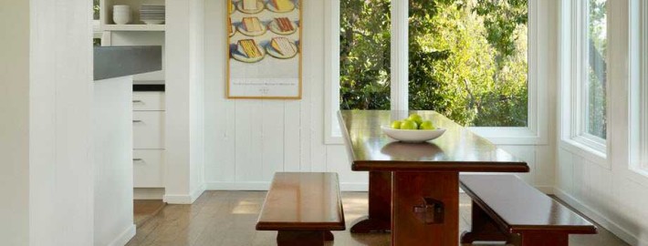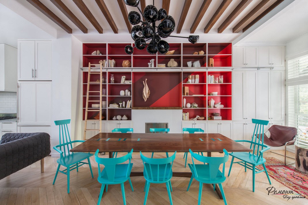 На этом фото представлен дизайн, где акцентами выступают: красный, бордовый (в качестве оттеняющего элемента) и ярко-бирюзовый и все это на белом фоне. Что получается? Красный будоражит нас и побуждает к действию, бирюзовый олицетворяет спокойствие моря. Зачем же использовать два столь противоположных влияния? Дело в том, что не зря они представлены именно в окружении белого цвета, он очень удачно их объединяет и даже в некоторой степени нейтрализует, составляя некую грань между активностью и умиротворенностью. На примере столовой это прослеживается в хорошем, но умеренном аппетите.