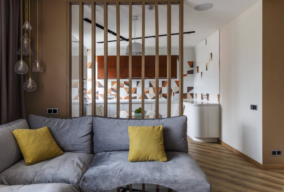 Перегородка может быть основательной полустеной или раскладной ширмой, а также стеклянной вариацией границы. Также в качестве перегородки может выступать мебель или стеллаж с полками, который послужит еще и дополнительным местом хранения посуды и прочих вещиц.