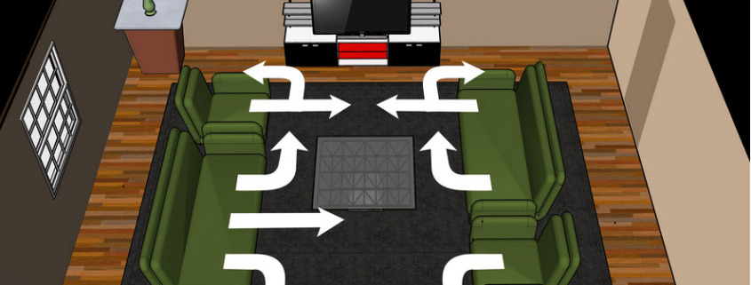 Если в комнате есть два выхода, то между ними обязательно должен быть свободный проход. Он может быть прямым или в виде дуги вокруг уголка для гостей.