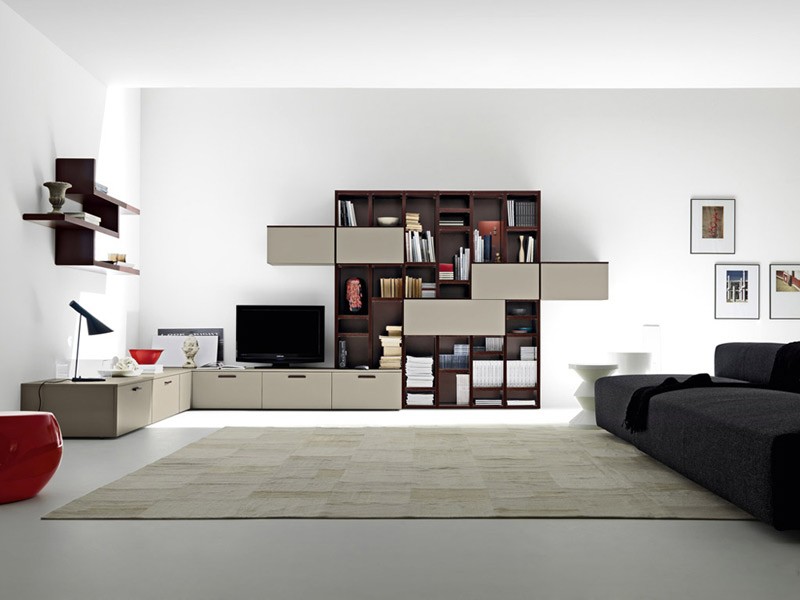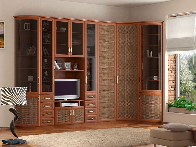 Гостиные угловые стенки также производят и в модульных вариантах. Их достоинство состоит в том, что они являются более легкими и чуть менее практичными. Секция для одежды в них, как правило, отсутствует, а отделения обычно выполняются в одинаково небольших размерах, в одном формате. Зато изменить внешний вид помещения с такой стенкой очень просто – модули легко переставлять с места на место, а соединяются они между собой с помощью навесных полок. В состав модульных угловых стенок для гостиной могут входить кроме обычных книжных полок и выдвижных ящиков, наклонные витрины, ящики для дисков, кронштейны для техники. В угловые стенки также практически всегда входит ниша под телевизор.