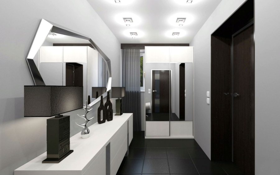 Лучшим дизайнерским решением на сегодняшний момент является установка в коридор шкафа-купе на одну из сторон стены. Таким образом можно зрительно увеличить объем прихожей и достаточно сэкономить пространство.