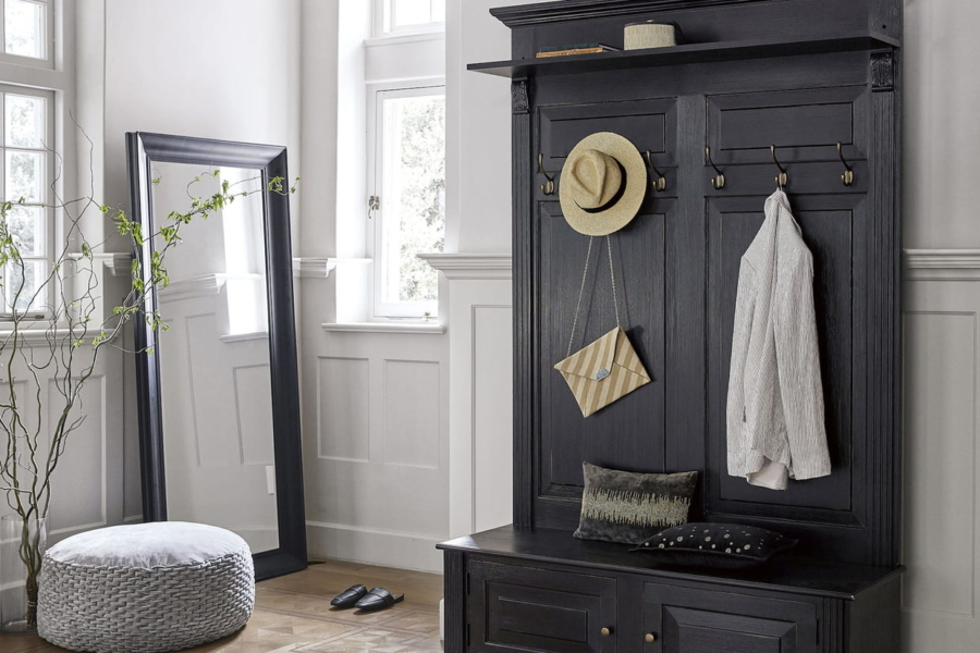 Меблировка прихожей в выбранном стиле обязательно должна быть изготовлена из натуральных природных материалов, таких, как дерево разных пород, ротанг, тростник. Наиболее подходящие оттенки – белая, бежевая, светло-коричневая.