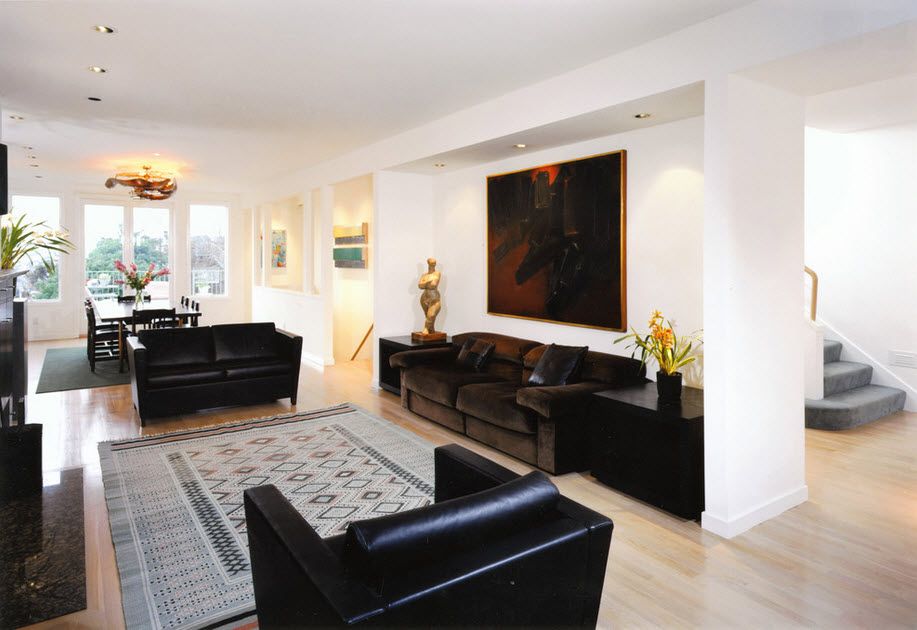 Теперь несколько слов о том, как разделить помещение на белую и черную зону. Возьмем, для примера, кухню и столовую, которые были организованы в одной комнате. Для стен и мебели гостиной стоит применить темные цвета, но выбрать светлый ковер. Далее помещение будет плавно перетекать в свою вторую часть, а именно в столовую. Границей послужит барный стол. Резкое деление – это не самая благоприятная картина для глаз, да и к тому же быстрый цветовой переход создаст впечатление, что это две разные комнаты совершенно несвязанные друг с другом. А потому стол нужно применить черный или коричневый, но сама его столешница должна иметь белый цвет – это и будет границей плавного тонального перехода. Барные табуретки или стулья лучше выбрать с темными ножками и белыми сиденьями. Далее, по мере того как гостиная переходит в столовую, темные тона полностью сменяются белыми: стенки, пол, стол для готовки, вытяжка – все это оформляется с помощью белого колорита.