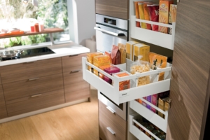 - Выдвижные ящики — очень удобное решение в шкафах, расположенных под столешницей. При выборе ящиков с полным открытием у вас будет легкий доступ ко всему содержимому.