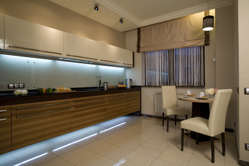 Освещение чрезвычайно важно на прямой кухне, а на современной — незаменимо. Поэтому дизайнеры всегда заботятся о том, чтобы правильно освещать рабочую поверхность, стол и отдельные зоны. Для этой цели используют различные типы освещения: