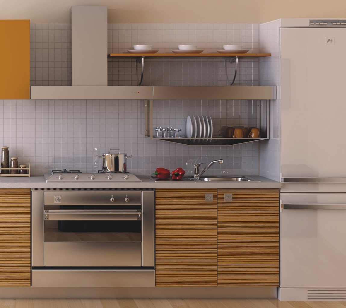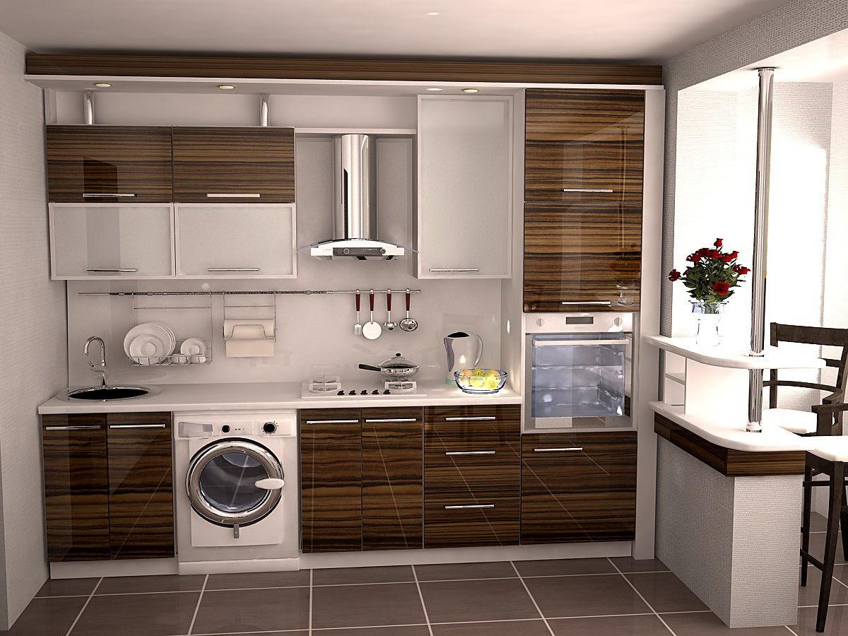 При расположении шкафов и бытовой техники на маленькой кухне в ряд, стоит соблюдать порядок: холодильник, раковина, плита. Расположение раковины посередине обеспечивает легкий доступ к воде во время первоначальной очистки продуктов и в момент приготовления. Вся бытовая техника на маленькой кухне должна быть отделена столешницей. Минимальная длина столешницы между холодильником и раковиной и с обеих сторон духовки составляет 40 см. На каждой маленькой кухне должна быть столешница длиной не менее 80 см. В прямой кухне обычно разделяется раковина и плита. На ограниченной площади плиту также можно разместить между холодильником и раковиной.