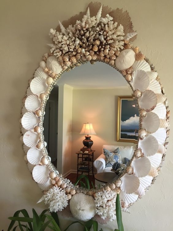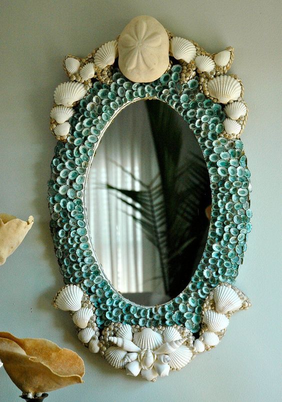 Рамка, оклеенная ракушками, галькой и другими морскими атрибутами пробудит воспоминания о море. Но чтобы надежно закрепить достаточно тяжелые элементы на основе, следует использовать хорошую клеевую базу, двухсторонний скотч или малярный грунт.