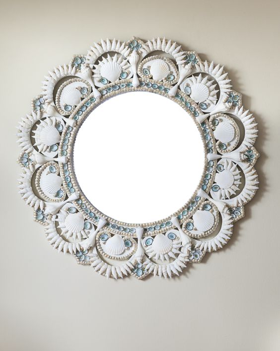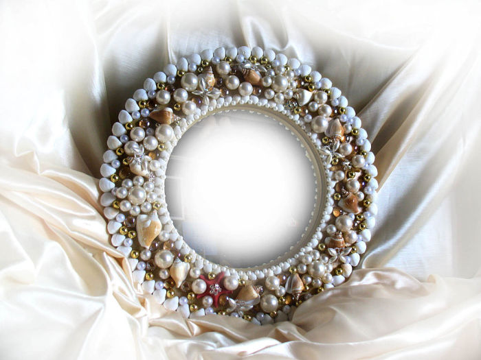 Раму для зеркала можно сделать из привычных материалов (например, плинтуса или старой рамки из-под картины), а лучше сотворить нечто более оригинальное и нестандартное. Для этих целей можно использовать все, на что хватит фантазии: мозаику, бусины, бисер, пайетки, жемчужины, ракушки, камушки, гальку, веревочный канат, мелкие ветки, всевозможные другие украшения и даже столовые приборы!