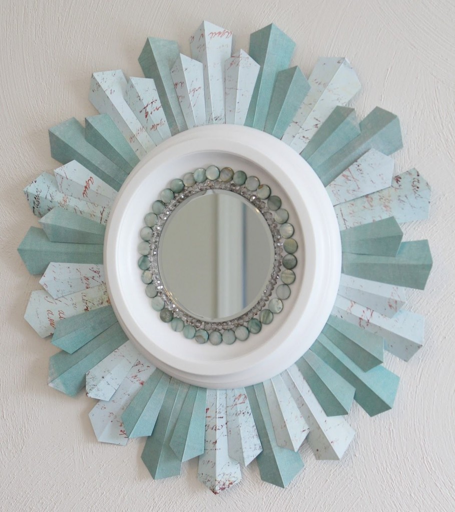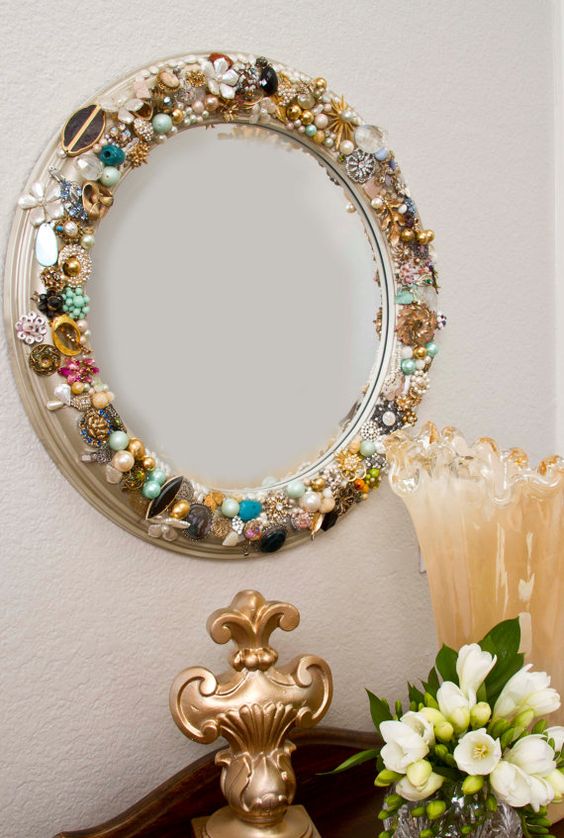 Осталось только приклеить зеркало посередине и пофантазировать с украшением этого произведения. В нашем случае – это крупные бусины по окружности.