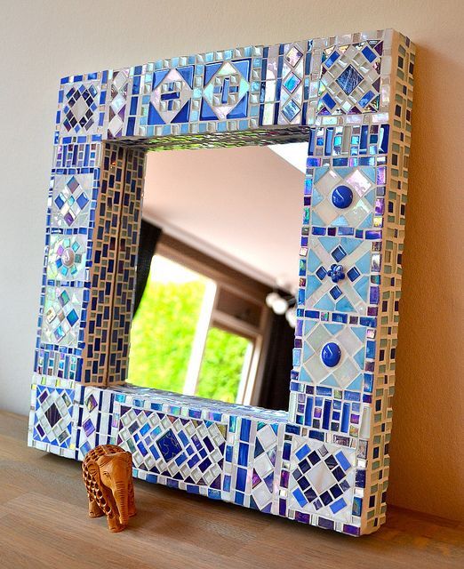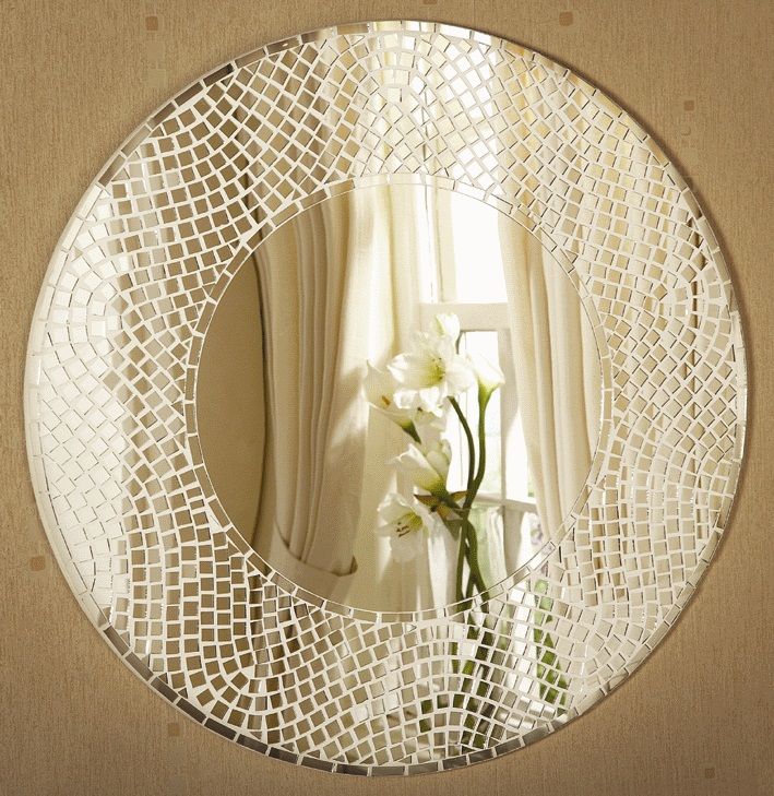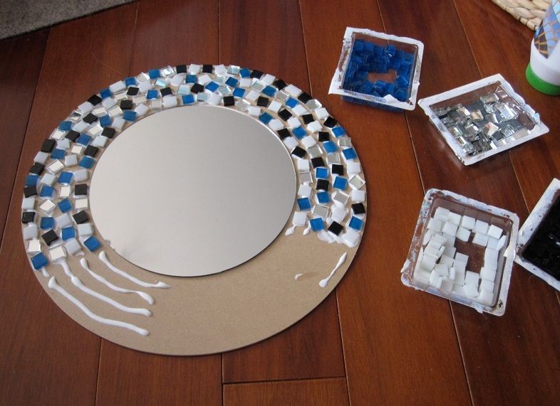 Также можно использовать осколки стекла, плитки, украшений. Зеркало крепится к основе из ДСП или листа фанеры. Естественно, ее размеры должны быть больше самого зеркала. И уже на выступающие края основы клеятся элементы мозаики.