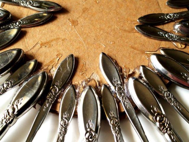 Прикладываем к картону столовые приборы, чтобы прикинуть конечный результат. Расположить приборы можно как в строгом порядке, чередуя по очереди вилки, ложки и ножи, так и в произвольном – на ваше усмотрение.