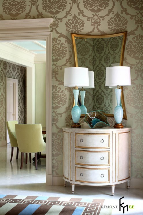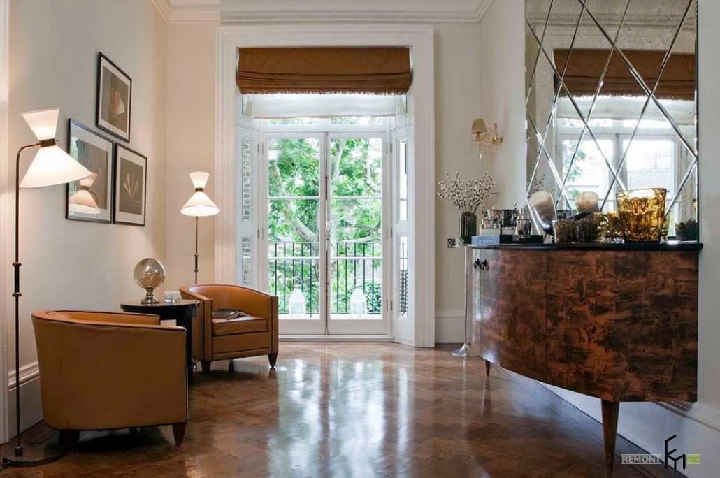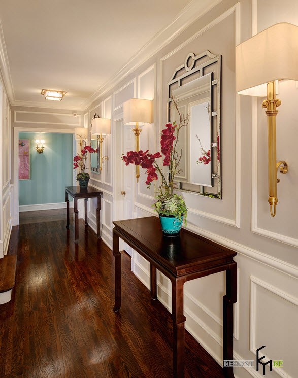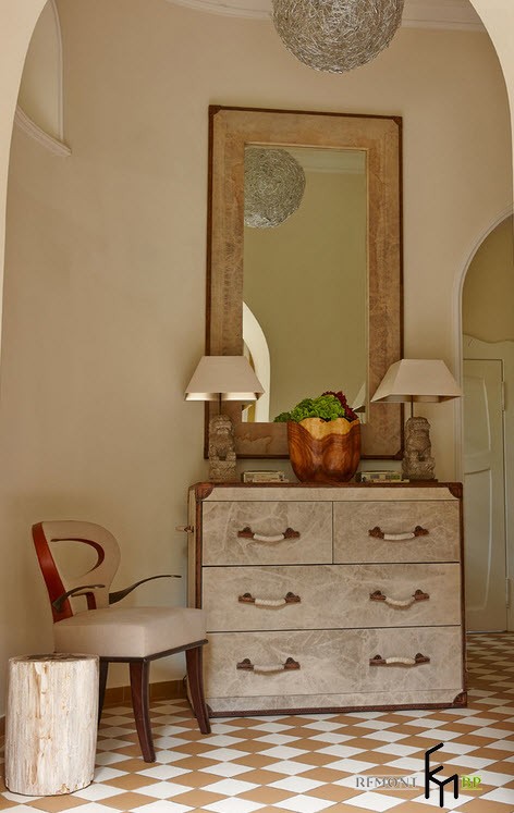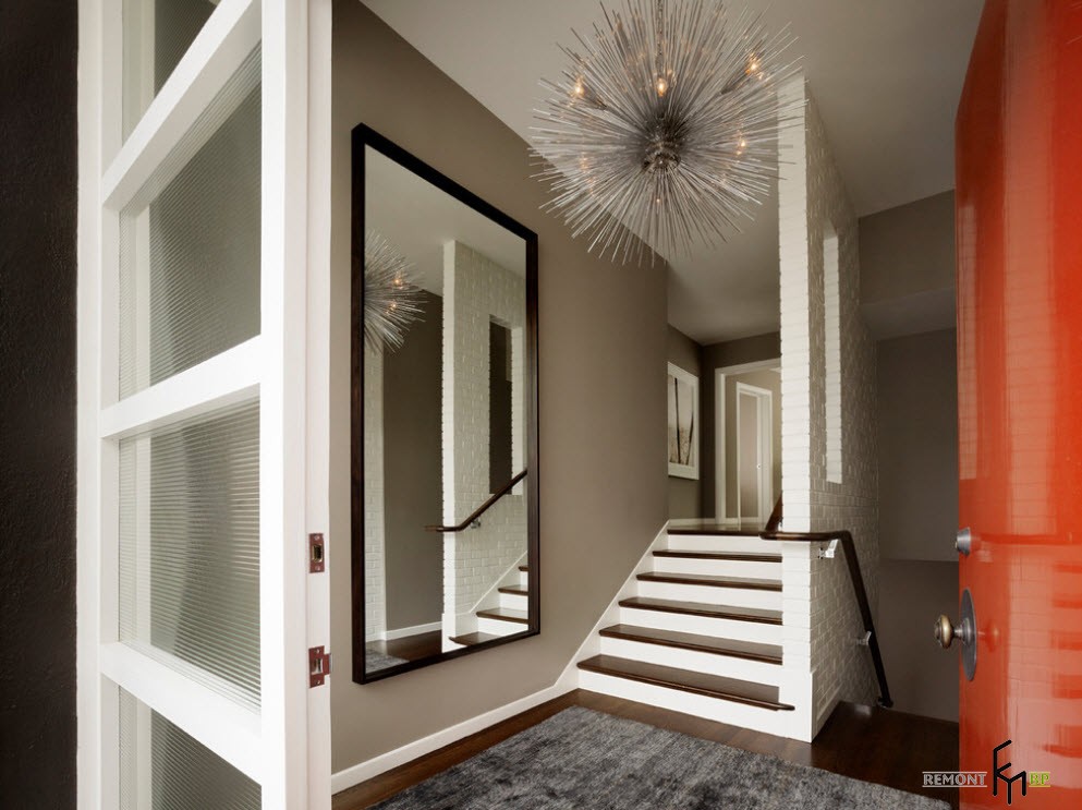 Поместив зеркало напротив какой-либо конструкции, можно создать эффект симметрии в интерьере прихожей. Это могут быть арки, картины, напольное покрытие, дверные проемы или люстры:
