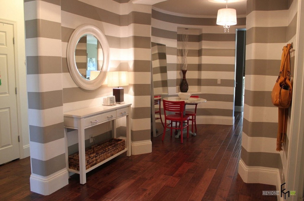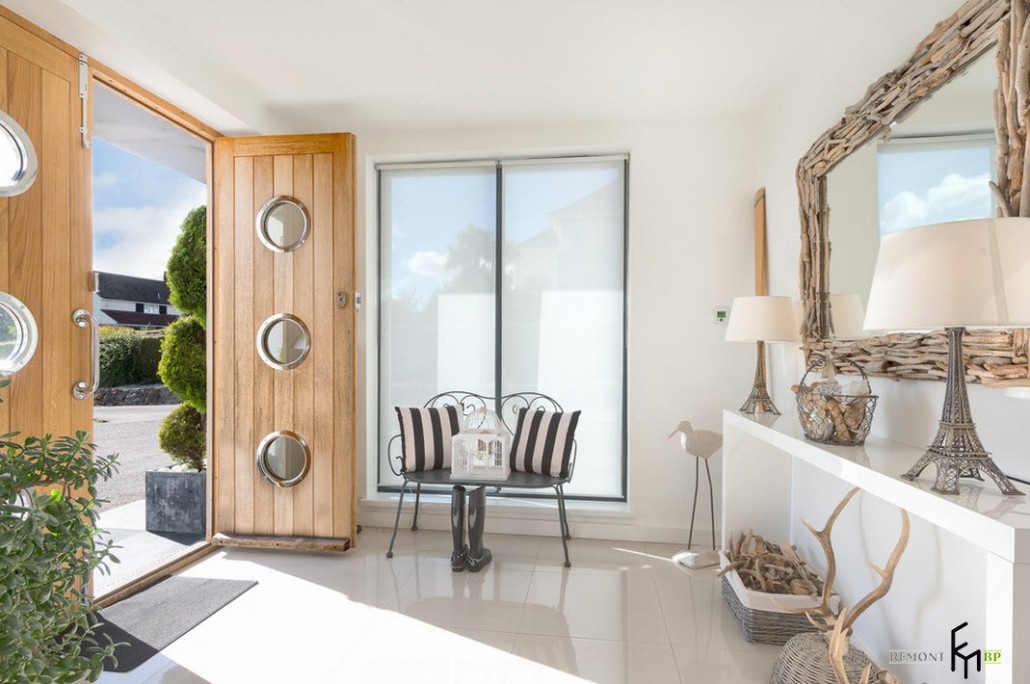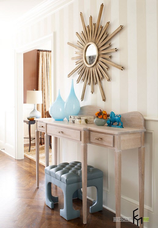 Миниатюрное зеркало играет во внутреннем убранстве прихожей роль одного из настенных стильных аксессуаров, т.к. оно не сможет полностью отобразить внешность человека. Маленькие зеркала, размещенные в прихожей большой площади, могут внести диссонанс в интерьер. В таких случаях зеркало лучше оформить в оригинальную раму, например, в форме солнца, где лучи выполнены из натурального дерева. Такой элемент подойдет для прихожих природных или деревенских стилях: