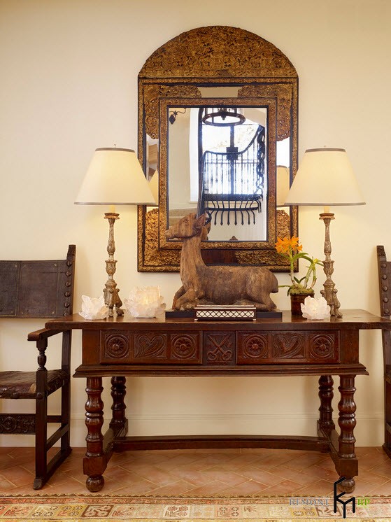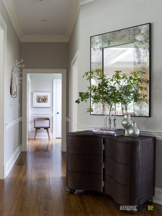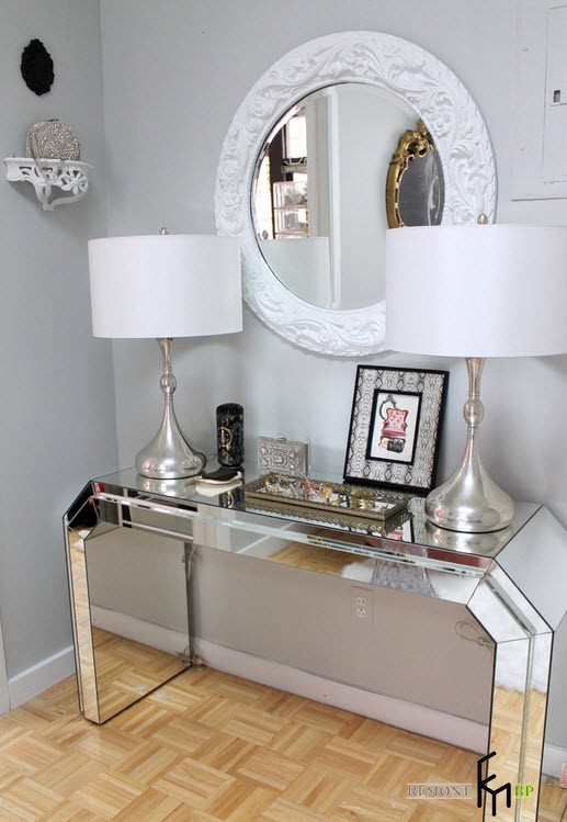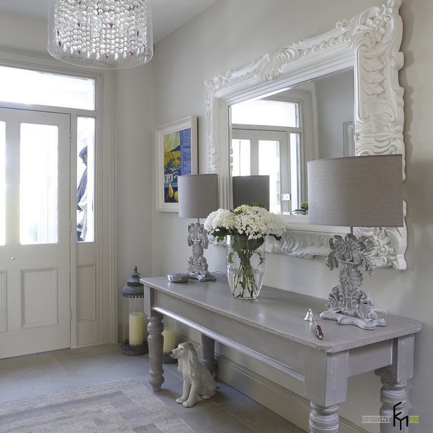 Антиквариат – это всегда дорого, роскошно и великолепно. Такие вещи в интерьере всегда привлекали внимание, а старинные зеркала привносят особый налет мистики и загадочности. Вы можете использовать настоящее антикварное зеркало или состаренное искусственно. Сегодня существует много способов превратить современное зеркальное покрытие в артефакт. Подбирая подобные экземпляры для прихожей, важно создать соответствующую мини-инсталляцию. Редкие патинированные пятна на зеркале из плиток гармонично сочетаются с другими аксессуарами и подставкой с потертостями: