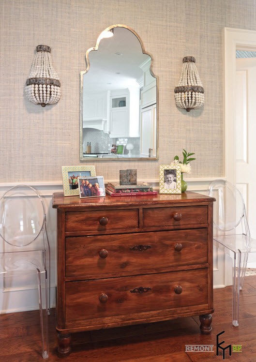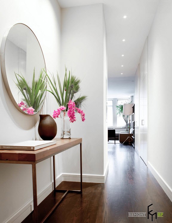 Если вы хотите создать дополнительный объем прихожей, то лучшим способом здесь станет большое зеркало, размещенное близко к полу или установленное на нем. Туалетный столик из прозрачного пластика придаст не только ощущение легкости, но и послужит своеобразным креплением для зеркала: