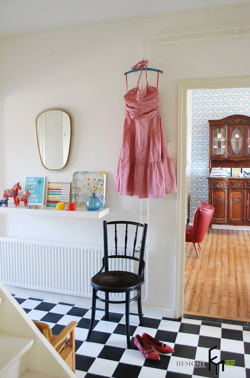 В прихожей, где сочетаются несколько стилей разных временных периодов, отлично впишется зеркало в стиле 60-х годов, напоминающее иллюминатор самолета той эпохи. Подобный вариант соединит разновременные предметы: