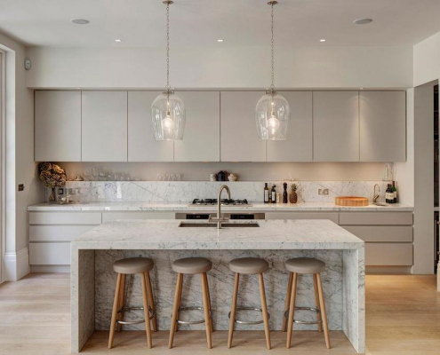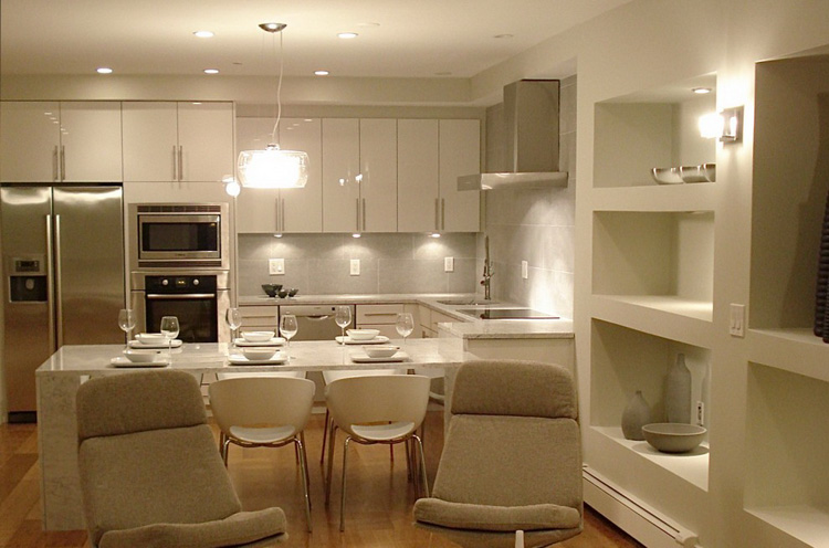 4. Электротехнические работы. При замене электропроводки учитывают насыщенность кухни разнообразными электроприборами. Целесообразней прокладывать отдельную электролинию с достаточным числом розеток. Освещение, кроме основного, должно быть дополнено точечными светильниками для подсветки всех необходимых зон на кухне. Если же производится полная замена проводки или установка газового оборудования, то здесь лучше обратиться к профессионалам.