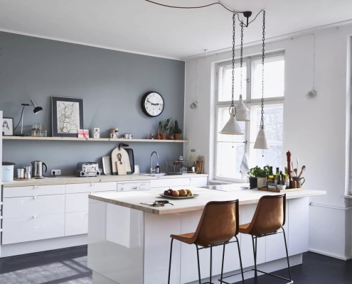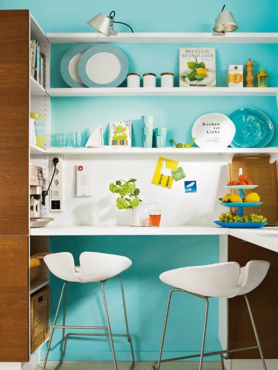 Наиболее простым вариантом будет их покраска. Простым, но неограниченным по возможностям. Стены можно покрасить однотонно либо выполнить непредсказуемое сочетание нескольких цветов. Можно также изобразить на стене оригинальный орнамент. Легче моется глянцевая краска, но если имеются недостатки на поверхности, она их подчеркнет. Лучше для кухни выбирать матовые или полуматовые покрытия.