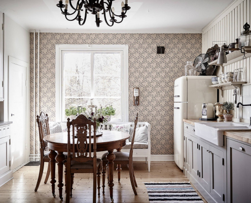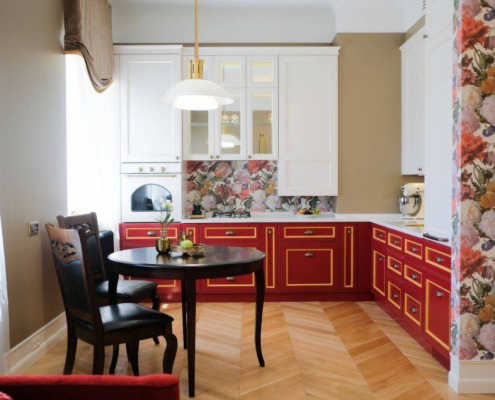Ремонт кухни своими руками часто не обходится без отделки стен обоями. Их выбор многообразен. Для кухни лучше подойдут виниловые или флизелиновые обои. Они легко моются, весьма прочны и защищают стены от пыли, грязи, жира, УФ-лучей и влаги. Флизелиновые обои к тому же очень экологичны, стены, покрытые ими, пропускают воздух и «дышат». Другой вариант – стеклообои. Кроме вышеперечисленных качеств, они обладают также высокой пожароустойчивостью и способны дополнительно армировать стены.