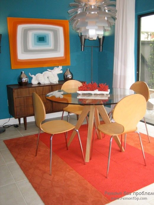 Что еще отличает стиль ретро, так это веселые и яркие цвета и оттенки, которые наполняют ваш дом или квартиру радостью и оживляют обстановку. Характерными являются кислотные цвета, именно они широко использовались в оформлении интерьера ушедшего столетия. Подойдут такие цвета, как: красный, ярко-розовый, сочный зеленый, синий, черный, оранжевый, белый. По своему желанию вы можете, конечно, выбрать и любой другой цвет, главное чтобы он был насыщенным, не стоит прибегать к размытым оттенкам. Очень популярны в современном дизайне ретро стиля горчичные оттенки, оливковые, кремовые, пурпурные и цвет авокадо. Также можно использовать несочетаемость в цветовом решении, главное не перемешивать их. Отлично подойдет тандем из оранжевого и синего цветов, зеленого и розового и так далее.