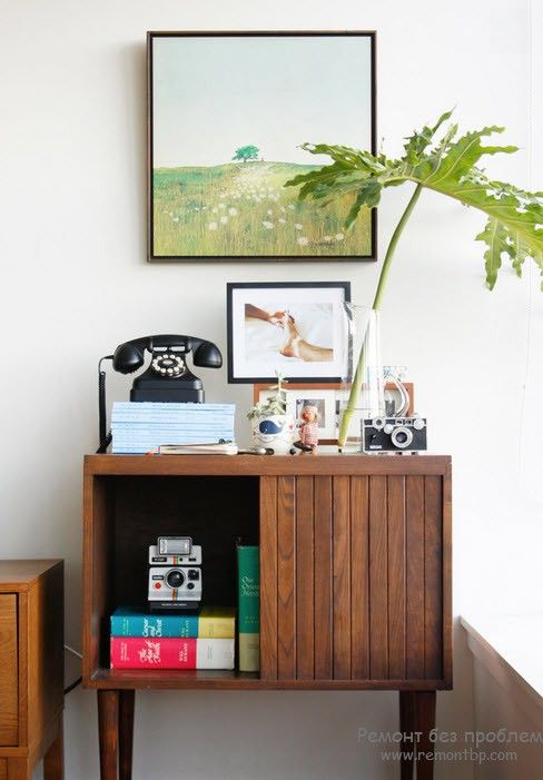 Ни один интерьер не будет полным без аксессуаров и предметов декора. Для ретро стиля подойдут именно те, которые были модными в том времени. Это могут быть: хрустальные вазы, цветные стеклянные графины, фотографии в деревянных рамках, картины прошлой эпохи, старые сервизы. Очень изысканным атрибутом старины считается старый телефон с диском.