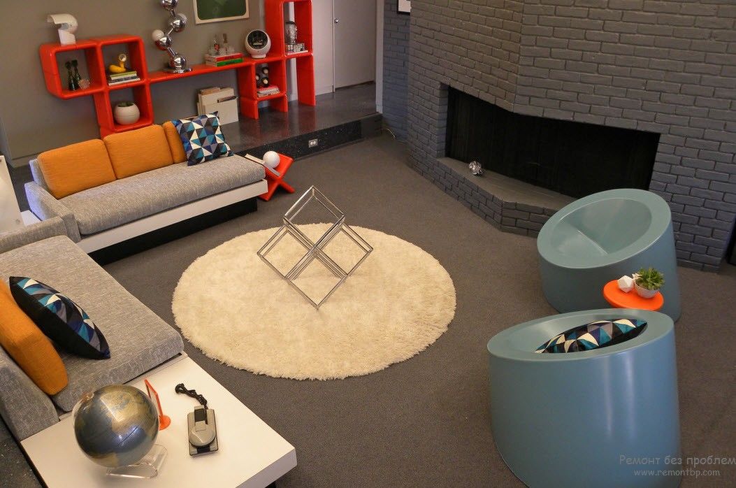 Для пола отлично подойдет покрытие линолеумом, натуральным деревом, можно покрасить однотонной краской. Очень хорошо будет смотреться пол из квадратной плитки в шахматном порядке, такой рисунок очень любили использовать многие жители тех годов. Также подойдет «лохматый» ковер, яркий палас.