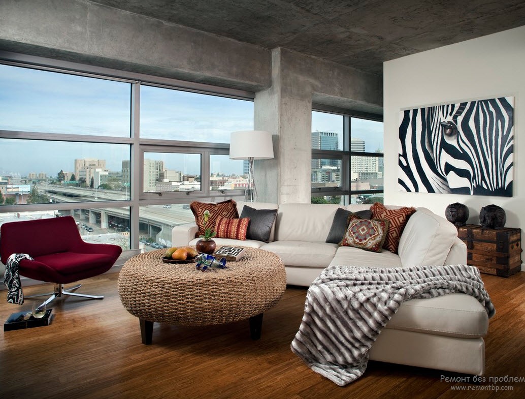 Африканские мотивы довольно популярны среди любителей экзотики. Интерьер квартиры с включением шкур экзотических животных (зебры, льва, пантеры) или их фрагментов вне африканского стиля выглядит довольно эксклюзивно и оригинально. При этом возможно использование, как натуральных шкур, так и их, очень качественных, копий.