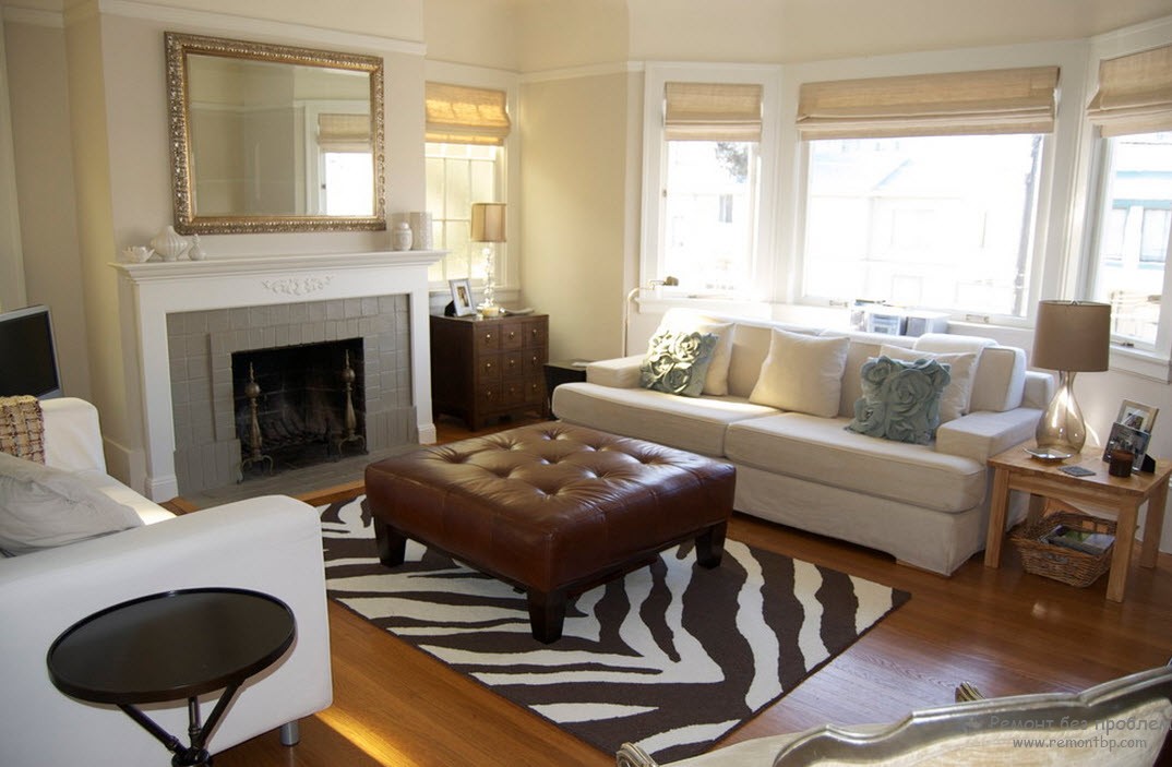 Использование в гостином помещении контрастных цветов шкуры зебры, коричневого и белого, в сочетании с кожаным диваном, да еще и возле камина, позволит вам приятно провести зимний вечер в семейном кругу, в кругу друзей. И, конечно же, ненавязчиво похвастаться друзьям экзотичностью своей гостиной