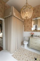 Даже такое скромное по размерам помещение, как санузел не может себе позволить нейтральности в отделке и меблировке. Нейтральность здесь применима лишь в выборе цветовых решений, а вот мебель выполнена в старинной манере, зеркало оправлено в резную, кружевную раму, а в конструкции светильников и аксессуарах сантехники проглядывается позолота.